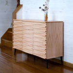 階段下のスペースに設置。綺麗に収まりました。波打つ前板の表情はインパクトはあれど他の家具とも馴染みやすく、不思議なバランスで部屋を彩ってくれます。節目のタイミングにインテリアでお役に立てて嬉しく思います。