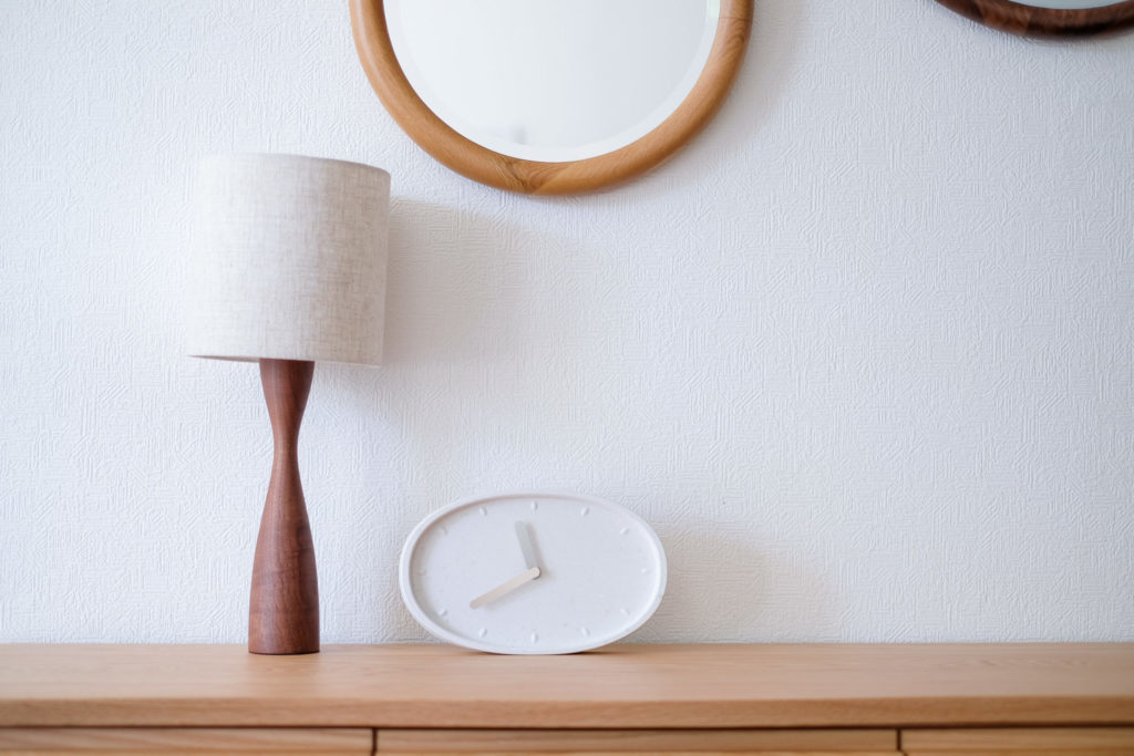 文字盤に数字は無いので横向き、縦向き、どちらでもお使い頂けます。横向きで自立しますので棚上やデスク上に置いての使用も可能です。