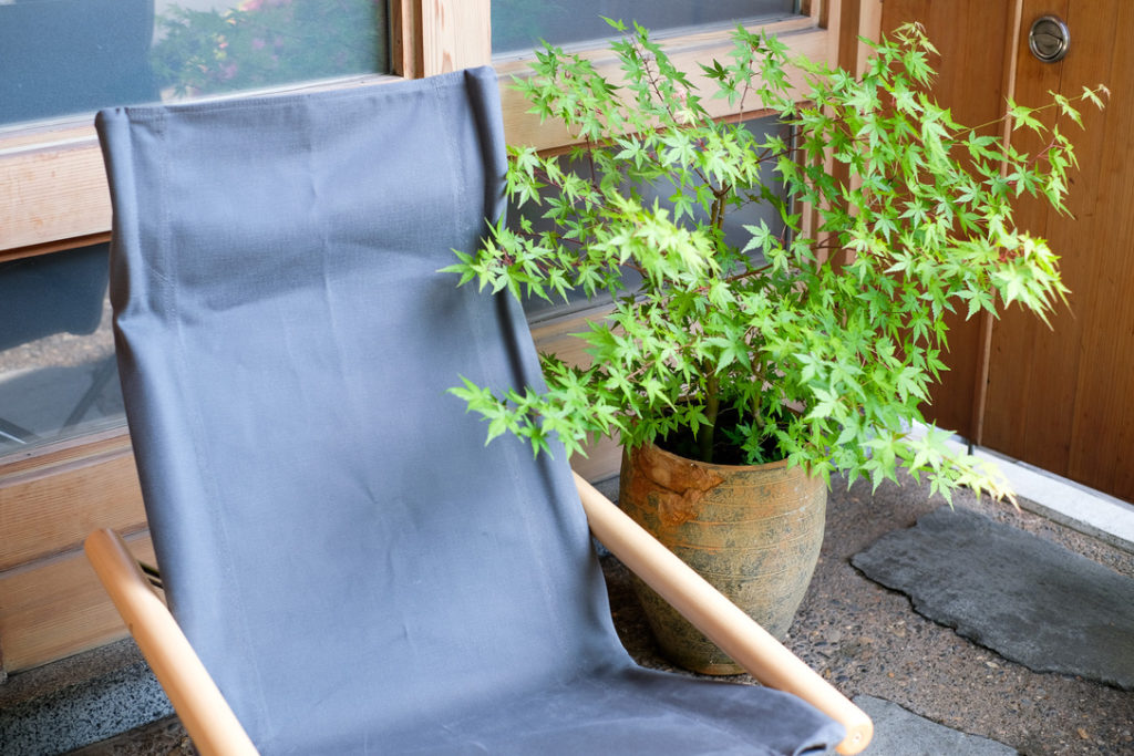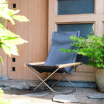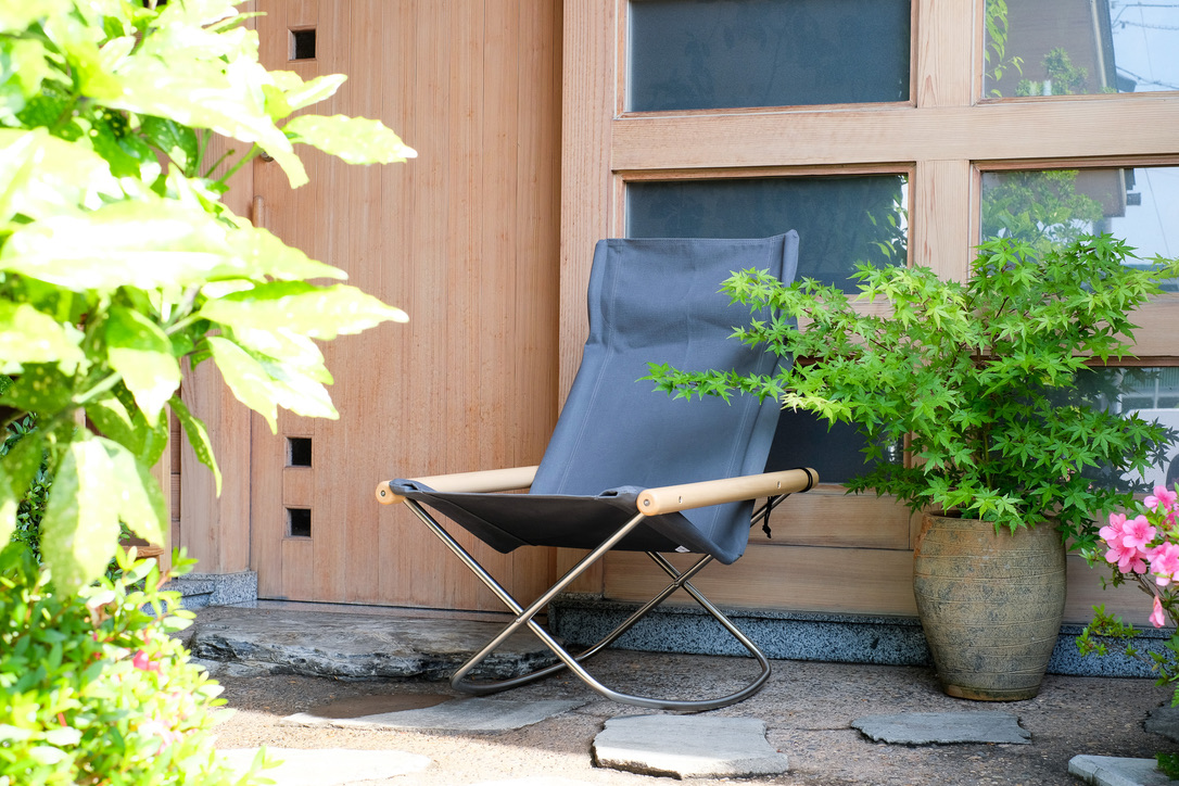 とても天気の良い日でしたので玄関先に置いて撮影させて頂きました。改めてとても外が似合うチェアだなと。そばにある植物は紅葉だそうで、秋にはまた雰囲気がとても良いのだろうなと想像します。素敵な玄関でした。
