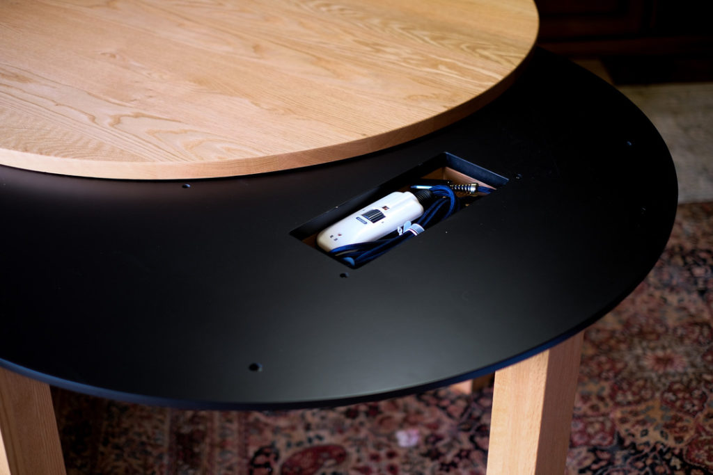 天板と脚はオークの無垢材、こたつと言われなければ通常の丸いダイニングテーブルに見えます。ちなみにコードは下天板に収納出来ます。夏の時期もスッキリです。