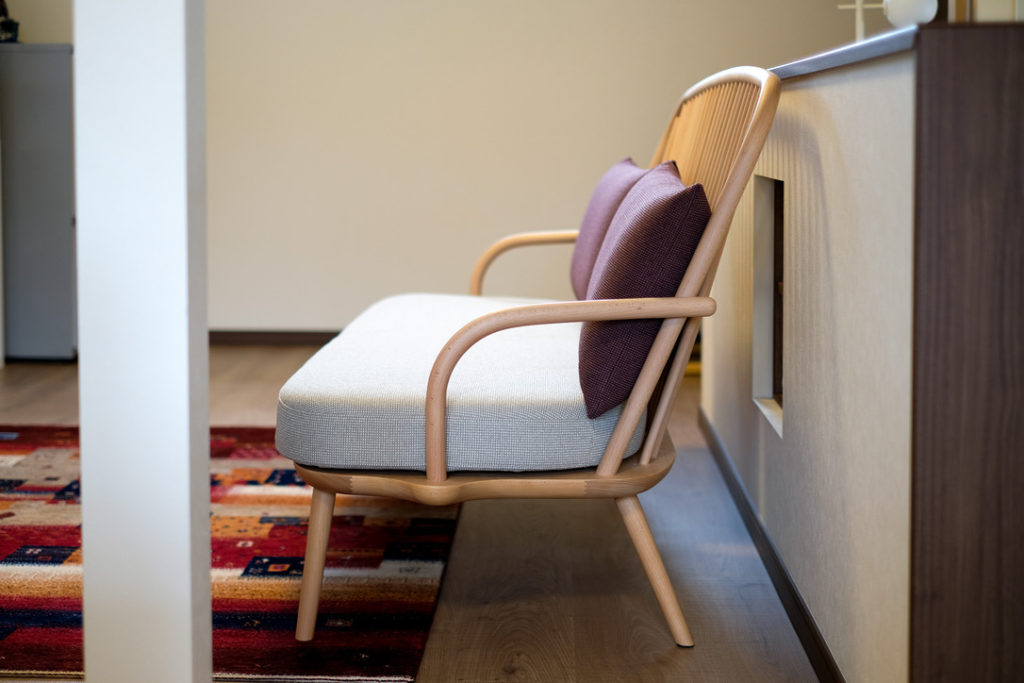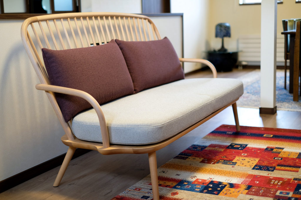 AWASE SOFA 3Pをお届けしてまいりました。ブナの木の白い木肌に、曲木加工による曲線。背もたれのスポークも印象的なソファです。肘掛けに合わせて座面のフレームがポコっと出ているのがポイント。スッキリとした雰囲気を保ちつつ、このソファならではの特徴的なデザインになっていると思います。