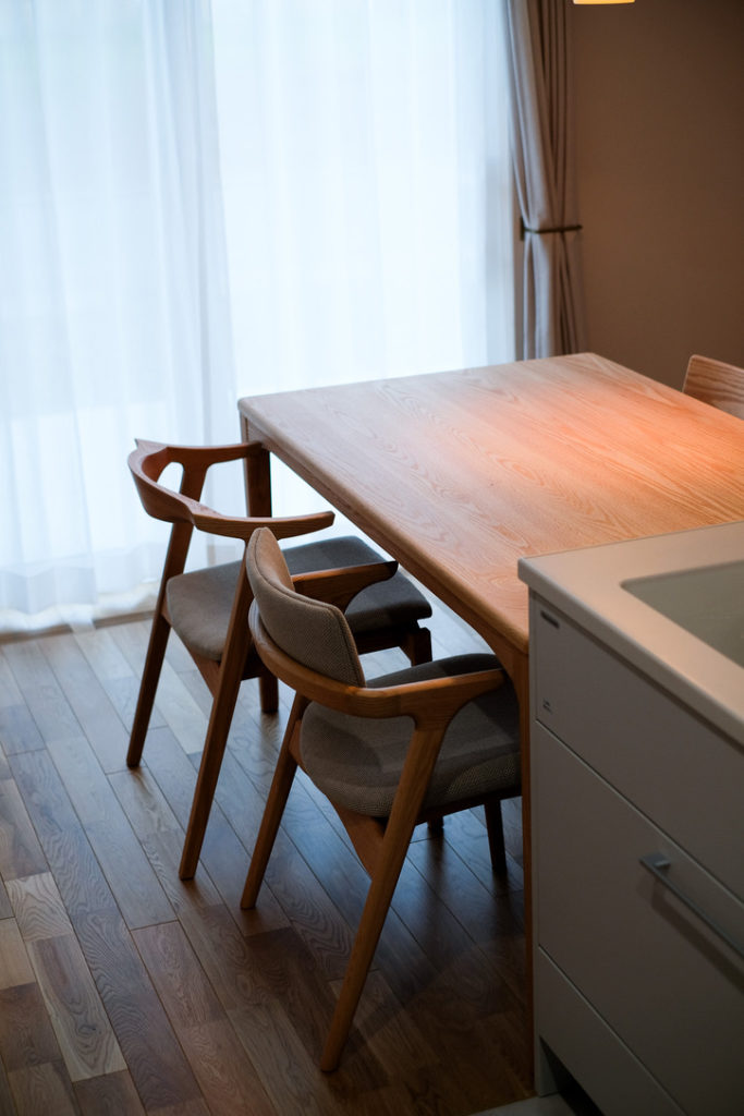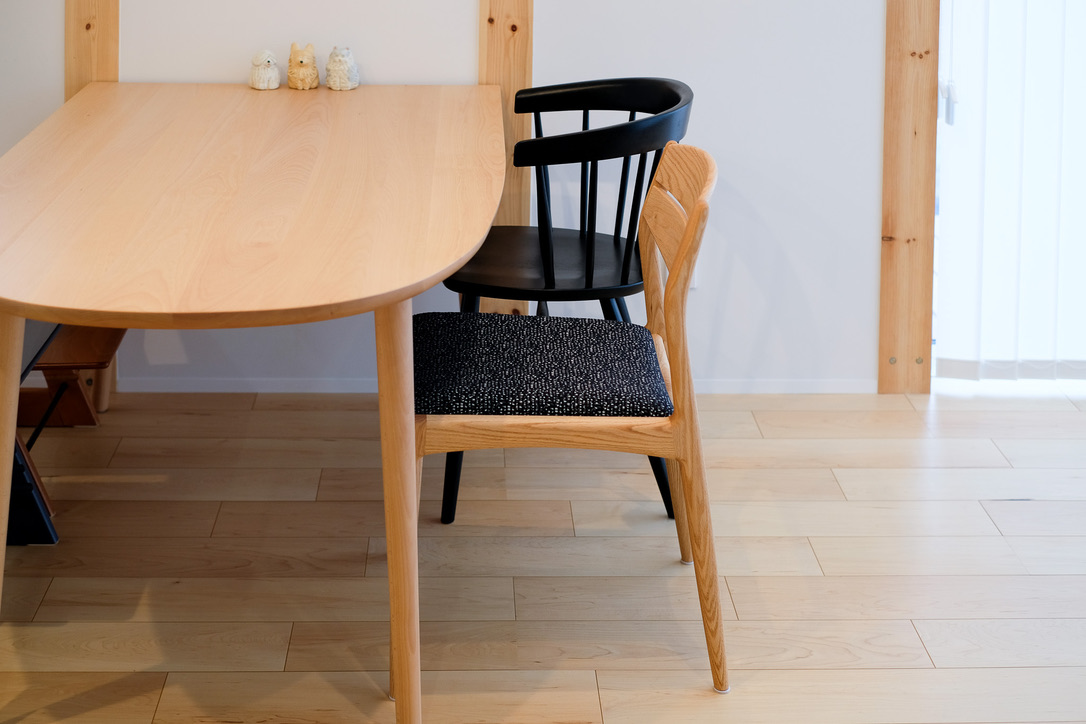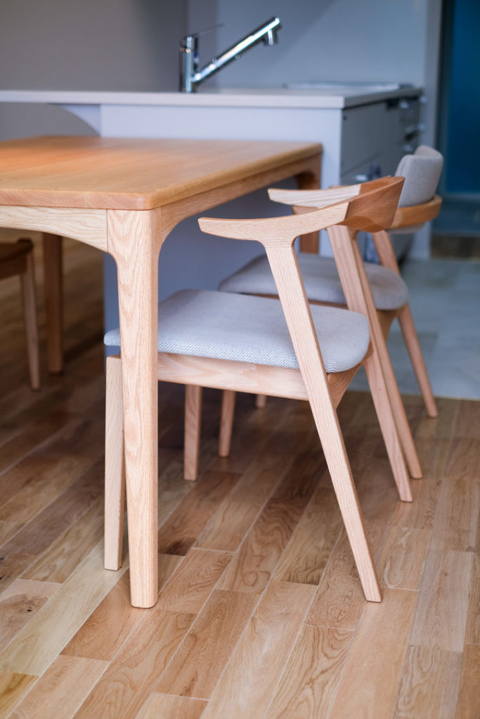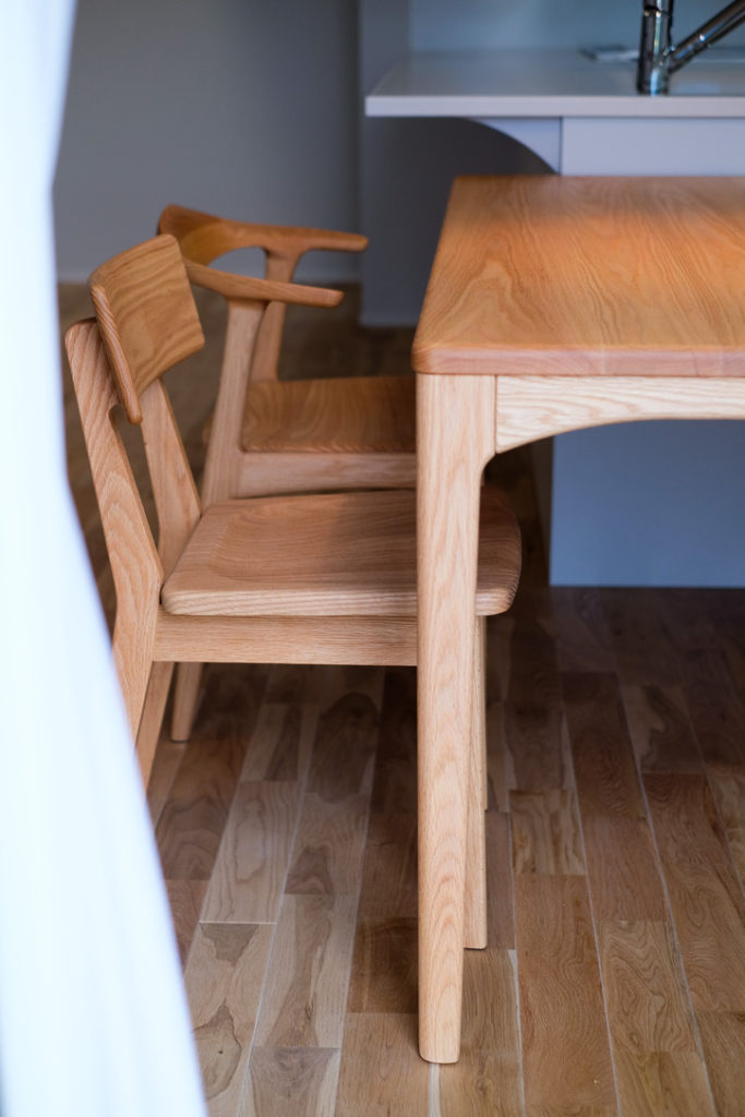 座面が木の椅子とダイニングテーブルはオイル仕上げ仕様。お子様が大きくなられたら、磨いてリフレッシュするのも良いなと話したり。手をかけながら末長く使って頂けたら嬉しいです。